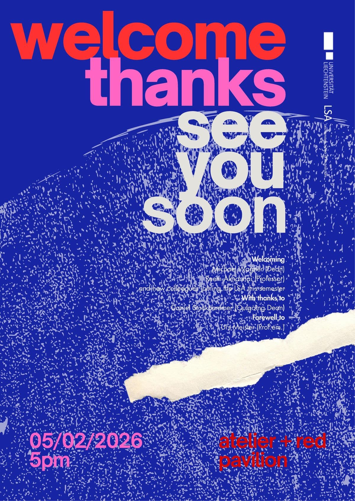WILLKOMMEN, DANKE UND BIS BALD Zum Start des neuen Semesters lädt die Liechtenstein School of Architecture alle Studierenden, Mitarbeitenden und Freunde herzlich ein. Wir begrüssen unseren neuen Dekan, Michael Wagner, und unsere neue Professorin, Reem Almannai, und freuen uns auf neue Impulse für die kommenden Jahre.
