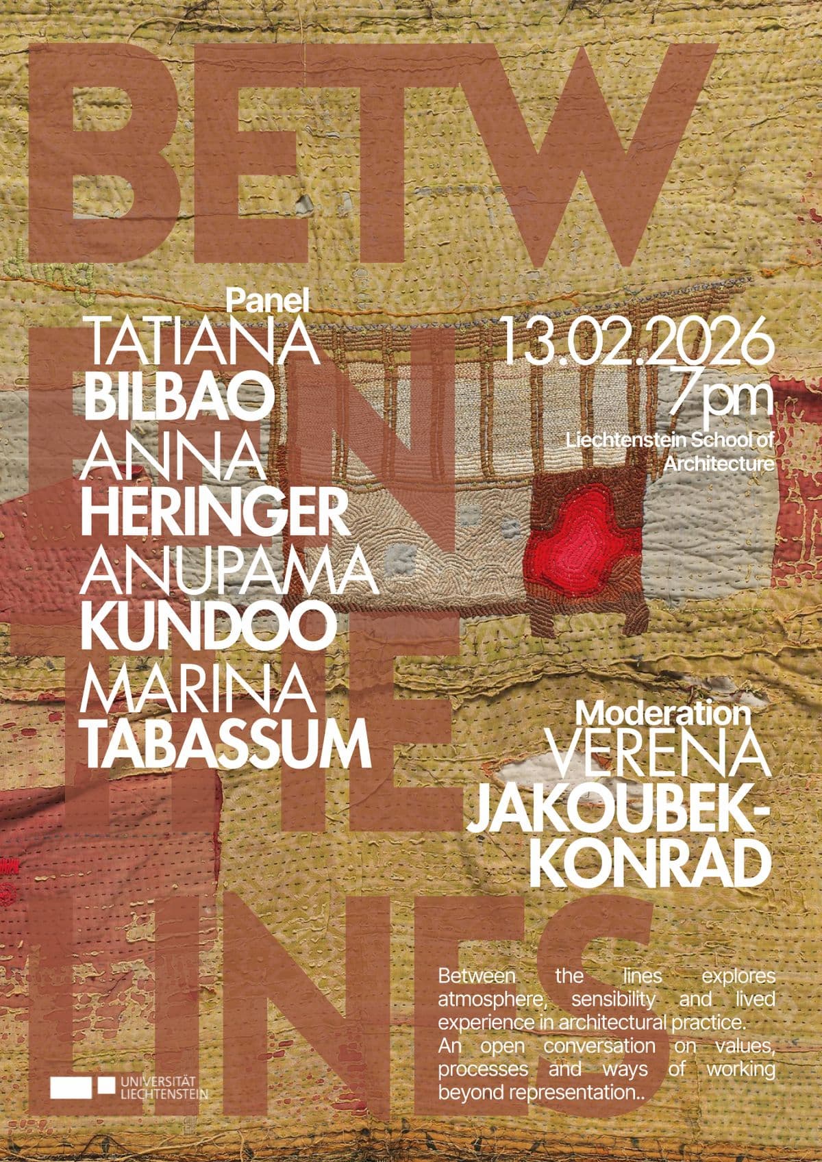 Wann: 23. Februar 2026, 19 Uhr Wo: Atelier, Campus Uni Liechtenstein Die Liechtenstein School of Architecture freut sich, vier herausragende internationale Architektinnen zu einem besonderen Ateliergespräch begrüssen zu dürfen: Tatiana Bilbao, Anna Heringer, Anupama Kundoo und Marina Tabassum. Das Gespräch findet auf Englisch statt.